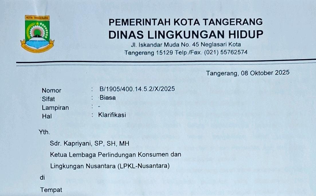 Informasi ini terungkap dari surat klarifikasi resmi Dinas Lingkungan Hidup (DLH) Kota Tangerang bernomor B/1905/400.14.5.2/X/2025, tertanggal 8 Oktober 2025, yang ditujukan kepada Lembaga Perlindungan Konsumen dan Lingkungan Nusantara (LPKL-Nusantara).